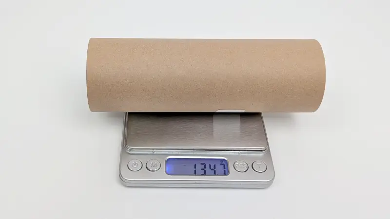 「コロコロ」の重さは実測134.7g。再生紙を使った厚紙のコロコロで、丈夫であることがすぐに分かります。
